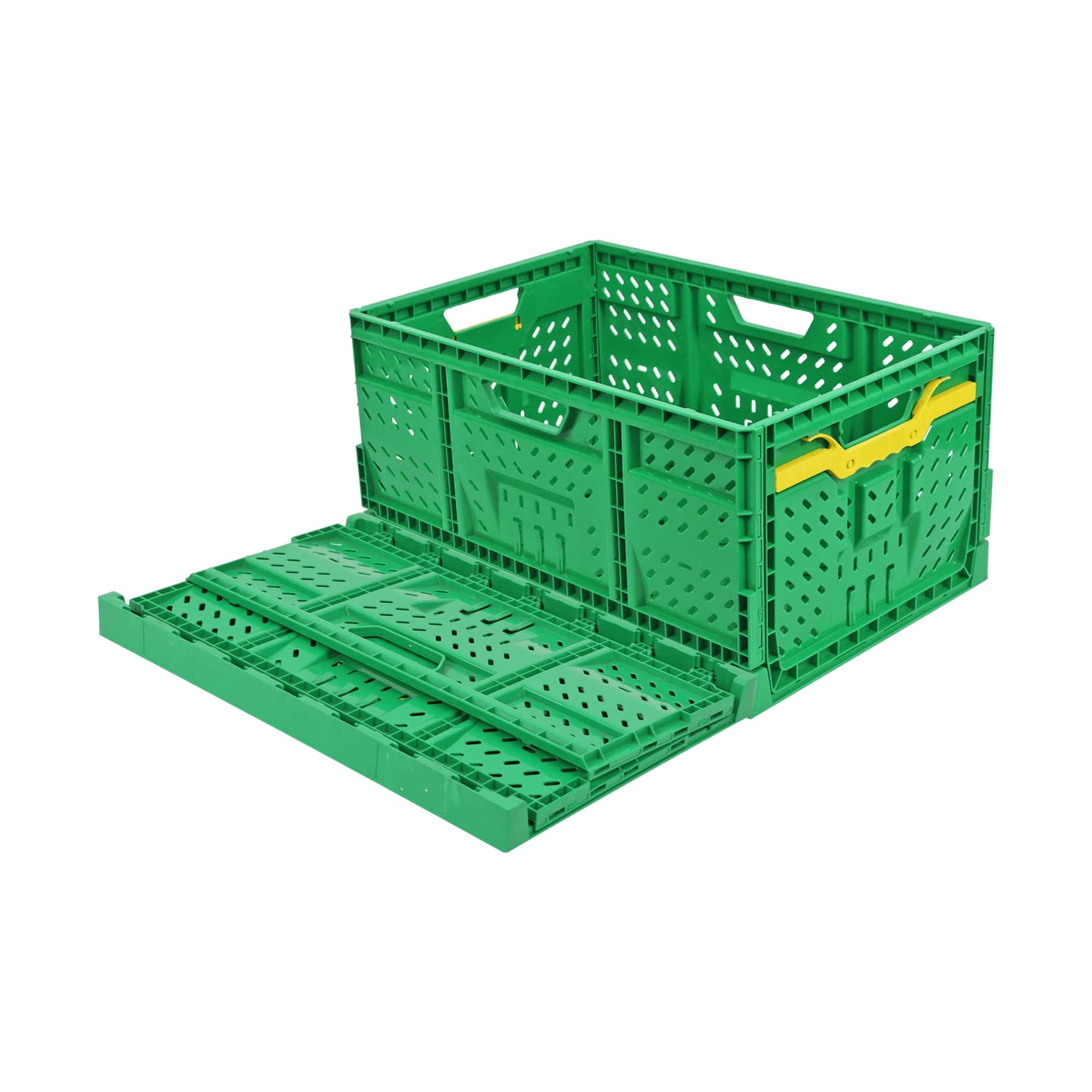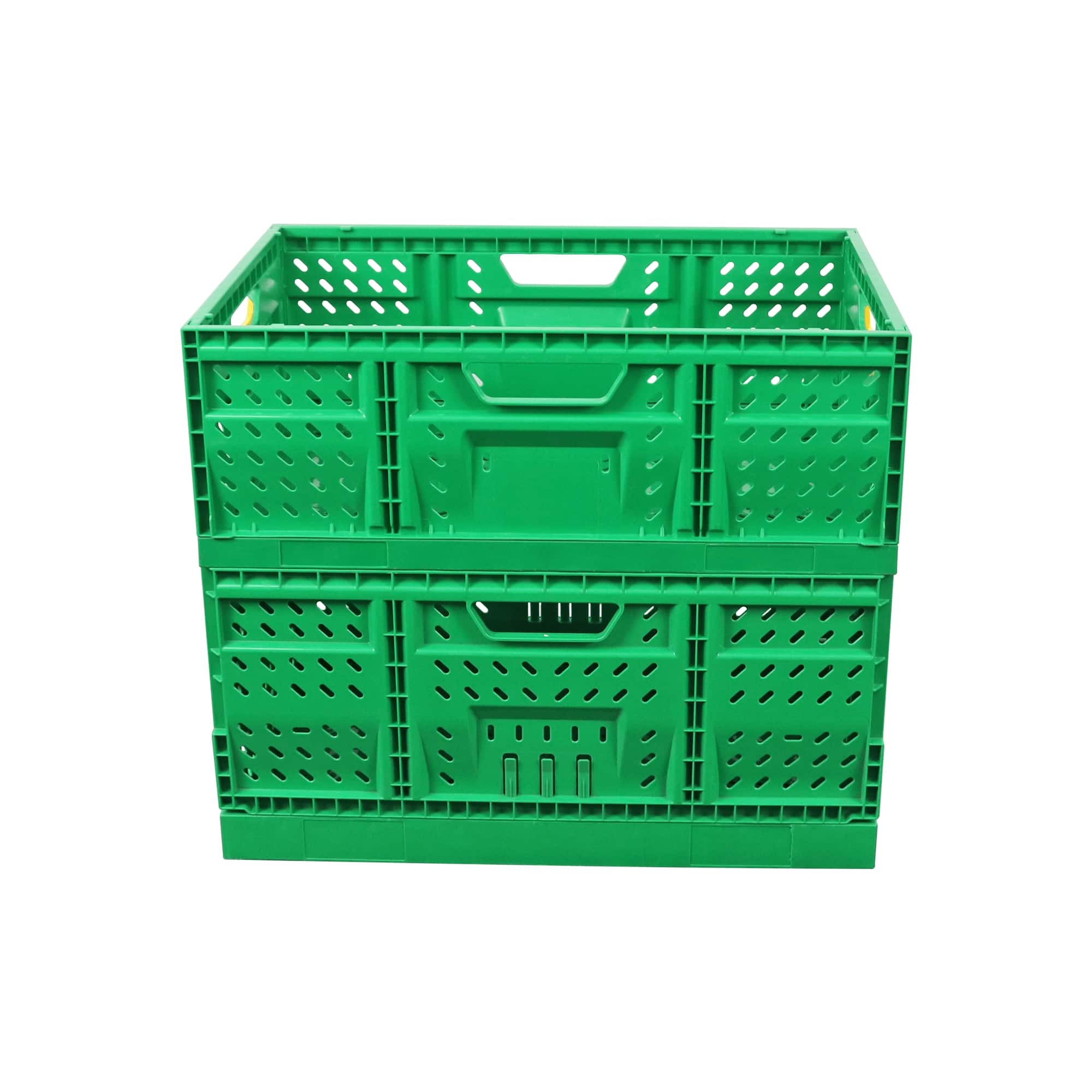 These green vegetable crates are designed for efficient storage, transport, and handling of fresh produce.